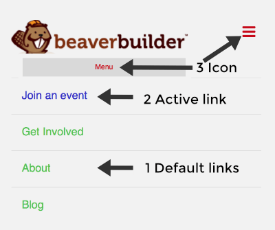 If you use the Beaver Builder Theme, you can use a CSS rule to customize the color of the hamburger icon or MENU text on small devices. You can also add custom CSS to customize the link colors in the mobile menu, which expands when you click the hamburger icon or menu text.