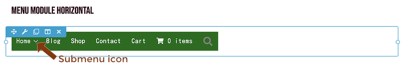 This option is a standard horizontal layout that supports dropdown submenus, with a Submenu layout choice of a down arrow, plus sign, or nothing. This screenshot shows a horizontal menu with a down arrow for the item with a submenu.
