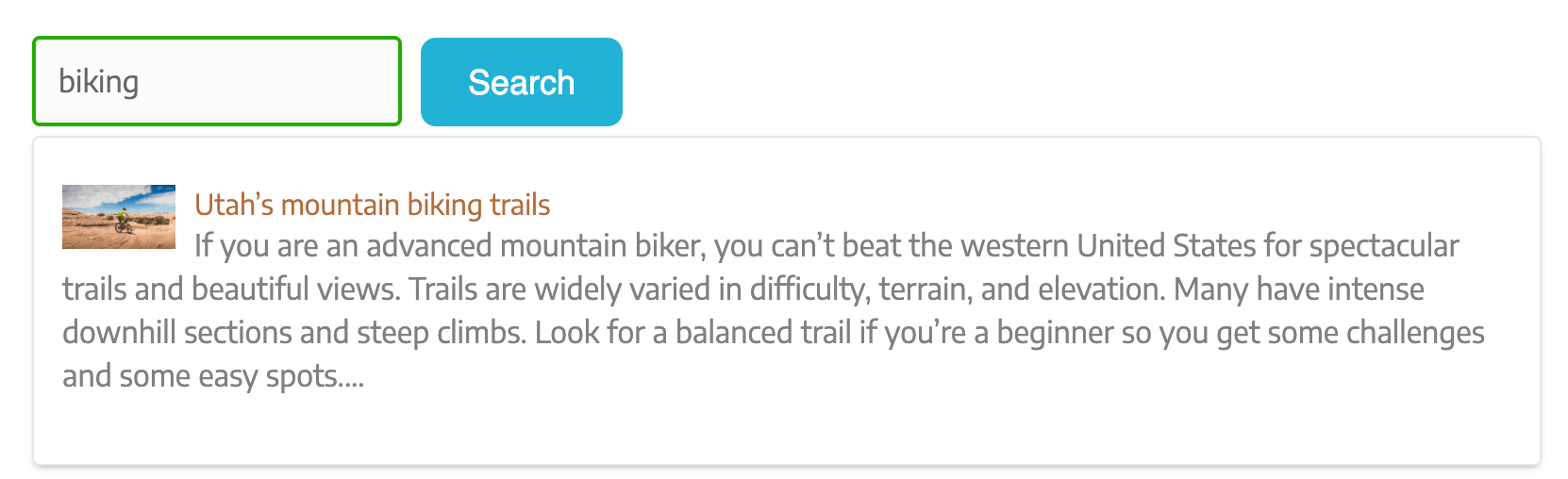 By default, the bordered search box is Full width, which means the same width as the search input field. You can set a custom width in the Width setting to change the size of the search results box. You can also choose whether to display the featured image, a fallback image, and an excerpt of the content. An example of these options is shown in this screenshot, in which Width is set to 800px and both Featured image and Content are set to Show.