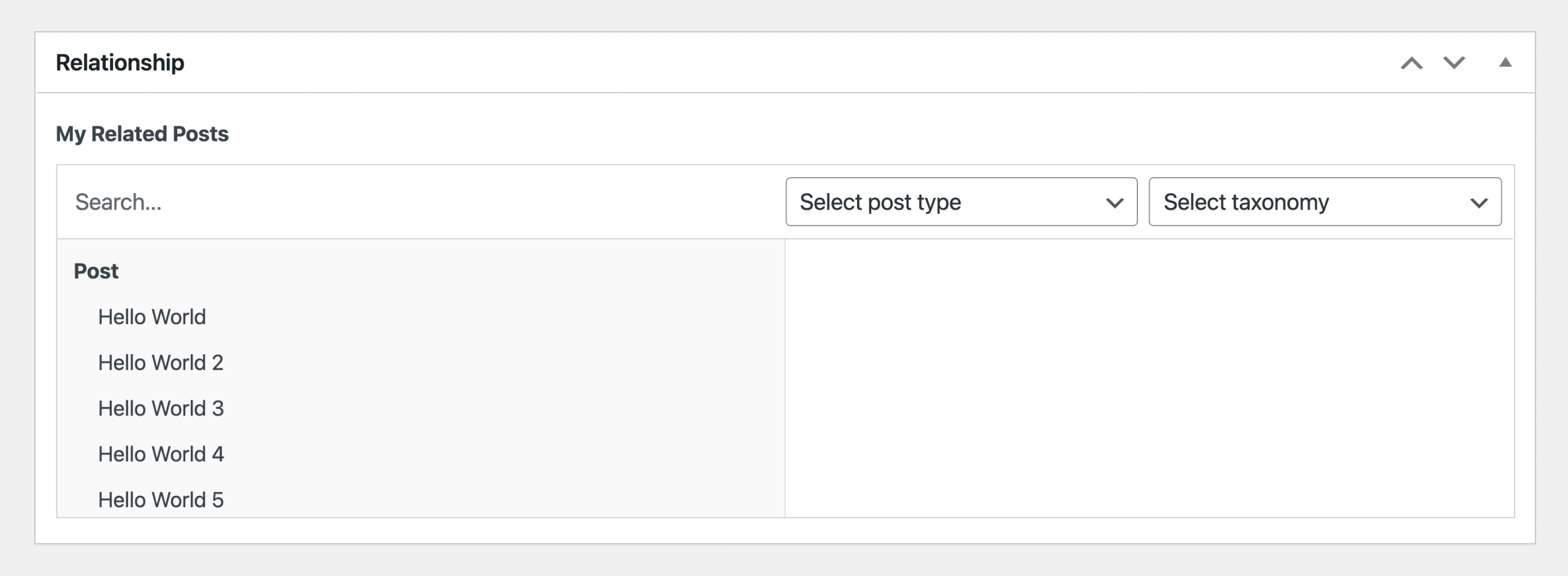 2. In your WordPress Admin Dashboard, create or edit a post or page for the post type you assigned the relationship field to.
