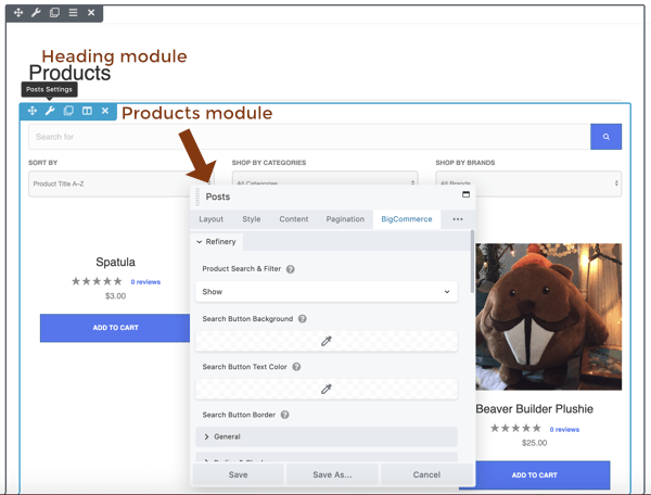 The Products module is actually a Posts module with some presets for BigCommerce product displays. It also has a BigCommerce tab, which lets you add fields to search and filter the products.