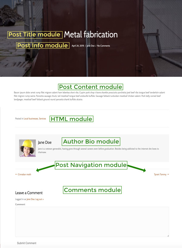 • The Post Content module pulls the post's content from the post itself. The post content is pulled from either the WordPress text editor or a Beaver Builder layout. In the following screenshot of a Singular layout, the post content area contains a Beaver Builder layout pulled from a post. Singular Themer layout with Beaver Builder post content layout