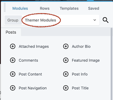 • It has special Themer modules that display post title, author, date, category, comments, post navigation, and featured image, as shown in this screenshot. The template for the Singular Themer layout already includes most of these modules.